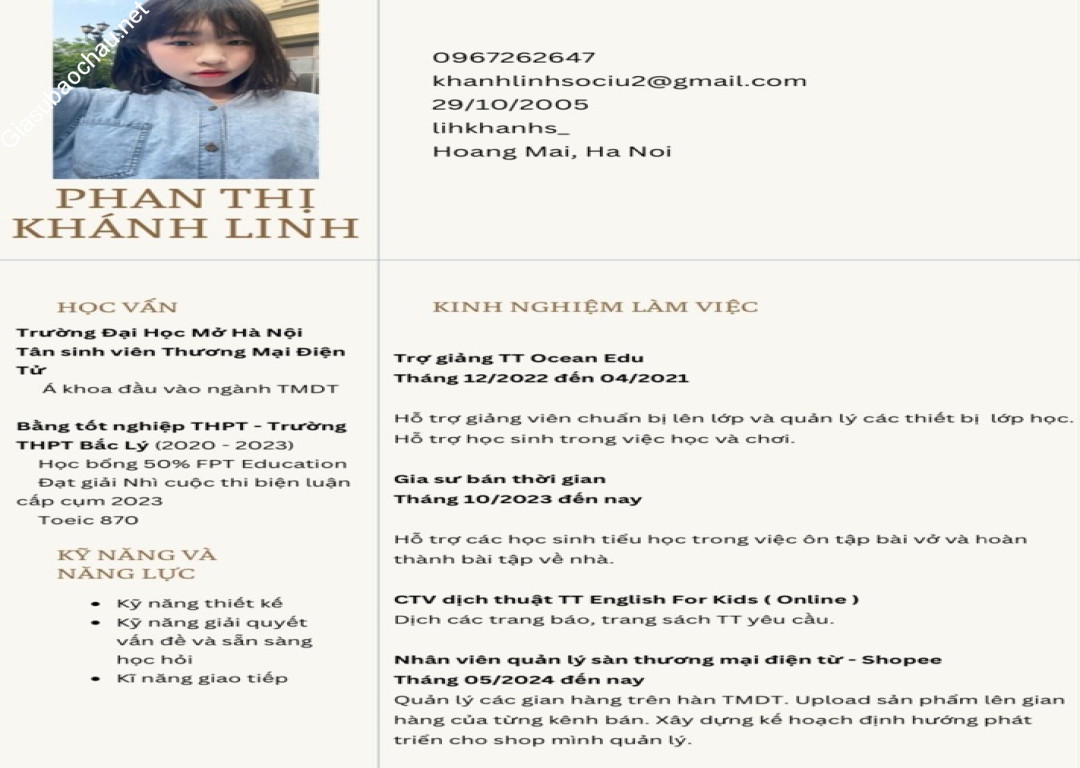 Quý phụ huynh vui lòng xem kỹ thông tin gia sư xem có phù hợp không rồi gọi tới một trong các số: 0966.042.043 (Cô Bảo Châu) - 0966.713.716 (Cô Lệ) của Trung tâm để thông báo việc lựa chọn gia sư này. Trung tâm sẽ gọi điện phỏng vấn gia sư thêm một lần nữa. Nếu gia sư đáp ứng yêu cầu và đồng ý dạy, Trung tâm sẽ gửi số điện thoại của Quý phụ huynh cho gia sư để hai bên trao đổi trực tiếp với nhau.