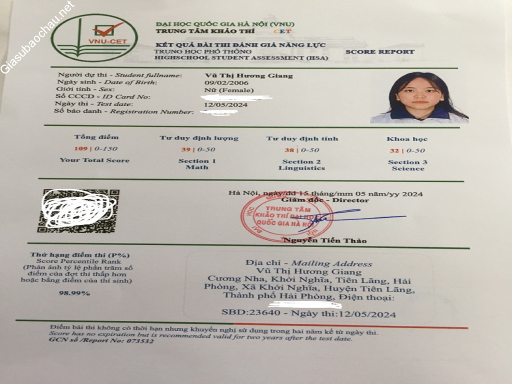 Về học lực, ở hai bộ môn Toán và Tiếng Anh, mình luôn có học lực giỏi trong suốt 12 năm học. Mình đã đạt giải Nhất cấp huyện, KK cấp TP trong kì thi giải Toán bằng Tiếng Anh, Nhì cấp TP trong kì thi Tiếng Anh qua mạng năm lớp 8. Năm lớp 9, mình đạt giải Nhất môn Toán, Nhì môn Tiếng Anh, Ba môn KHTN bằng Tiếng Anh trong kì thi chọn HSG cấp huyện. Trong 3 năm học THPT, điểm trung bình môn Toán của mình lần lượt là 9.4-9.5-9.7, môn Tiếng Anh là 9.8-9.8-9.7. Mình đã đỗ ĐH Kinh tế quốc dân với điểm xét tuyển là 27.58, trong đó môn Toán là 8.8, Ngữ Văn là 9.5 và Tiếng Anh là 9.2. Bên cạnh đó, mình cũng đã đỗ xét tuyển sớm của Trường ĐH Ngoại ngữ- ĐHQGHN với số điểm 109 trong kì thi ĐGNL do ĐHQGHN tổ chức, trong đó điểm phần Định lượng (Toán) là 39/50 điểm. Mình cũng từng giành suất học bổng trị giá 5.000.000 vì đã đạt overall 5.5 IETLS trong kì thi Đánh giá năng lực Tiếng Anh chuẩn IELTS do Tổ chức giáo dục Summit kết hợp với Hội đồng Anh tổ chức.