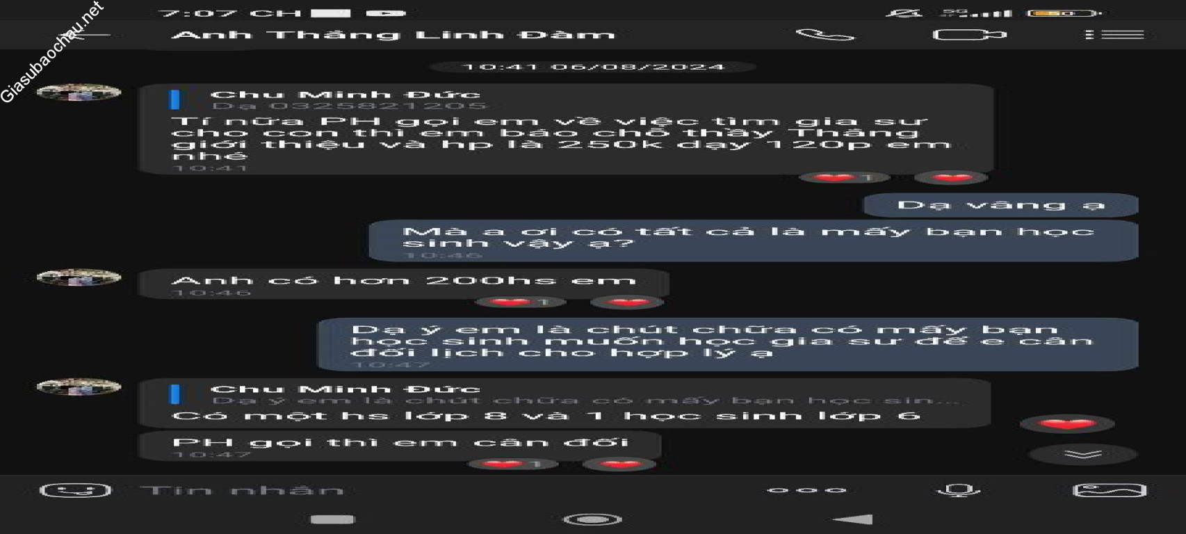Quý phụ huynh vui lòng xem kỹ thông tin gia sư xem có phù hợp không rồi gọi tới một trong các số: 0966.042.043 (Cô Bảo Châu) - 0966.713.716 (Cô Lệ) của Trung tâm để thông báo việc lựa chọn gia sư này. Trung tâm sẽ gọi điện phỏng vấn gia sư thêm một lần nữa. Nếu gia sư đáp ứng yêu cầu và đồng ý dạy, Trung tâm sẽ gửi số điện thoại của Quý phụ huynh cho gia sư để hai bên trao đổi trực tiếp với nhau.