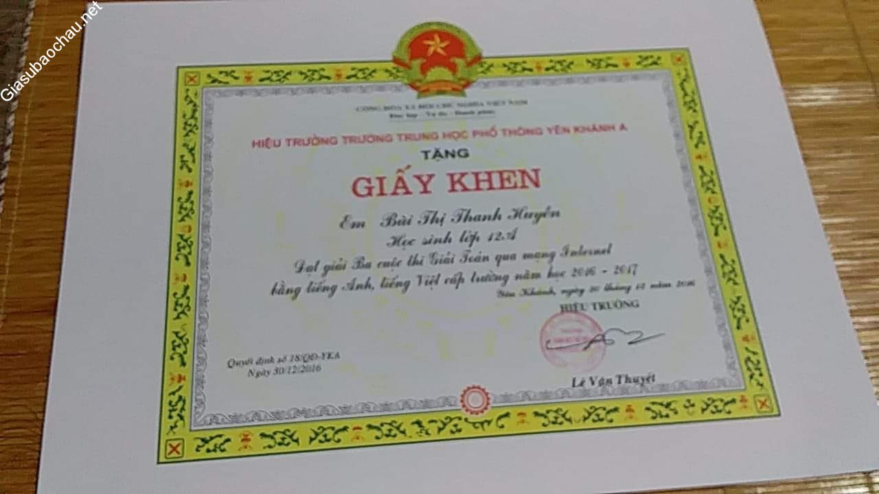 + Tham gia các cuộc thi học sinh giỏi huyện môn Tiếng anh từ lớp 6 đến lớp 9 và đều được giải. Lớp 9 mình thi học sinh giỏi cấp huyện được giải Nhì và được chọn thi học sinh giỏi tiếng Anh cấp Tỉnh và được giải khuyến khích. Dù học ban A nhưng mình cũng có kiến thức cơ bản về môn tiếng Anh nên có thể hỗ trợ học sinh bên cạnh các môn học khác