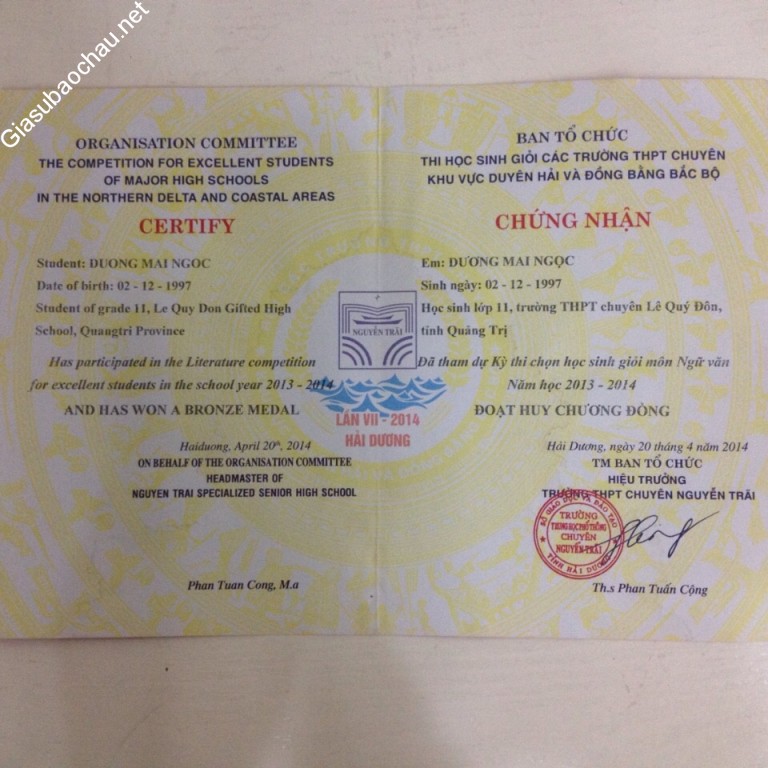 - Đạt giải Khuyến khích môn Ngữ văn lớp 12 trong kỳ thi Học sinh giỏi cấp tỉnh năm lớp 11 (kỳ thi này dành cho học sinh lớp 12 nhưng cháu thi vượt lớp)