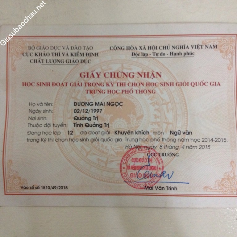 - Đạt giải Khuyến khích môn Ngữ văn trong kỳ thi Học sinh giỏi cấp Quốc gia năm lớp 12