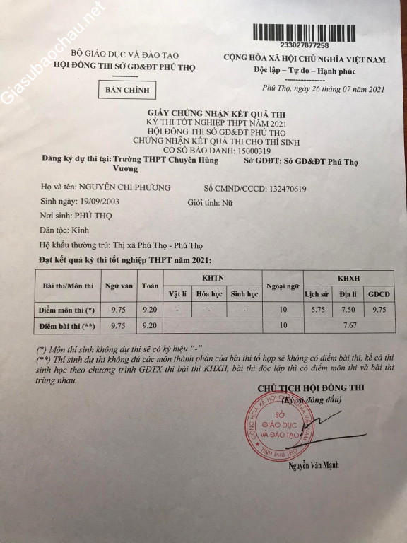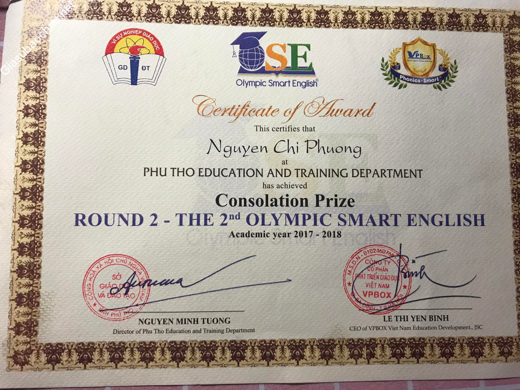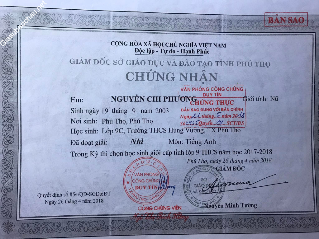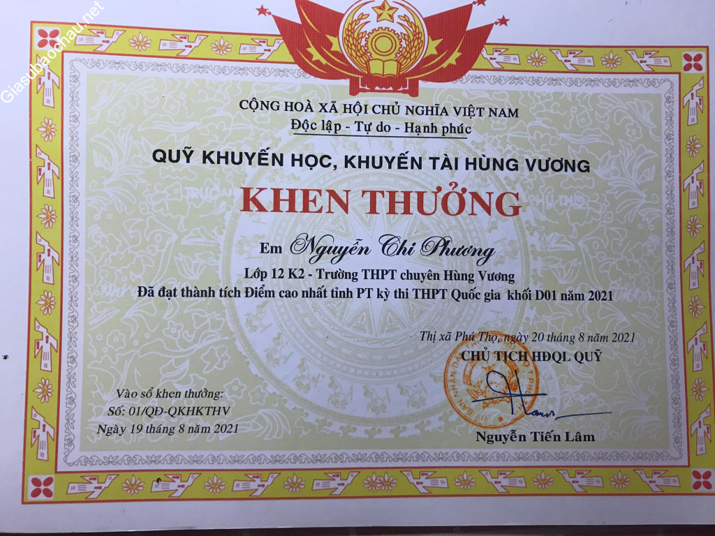 Thành tích học tập: Từ cấp 1 đến cấp 3 em luôn là học sinh xuất sắc đứng đầu toàn trường. Em đã có 4 năm cấp 2 theo đuổi đội tuyển Tiếng Anh và gặt hái nhiều giải thưởng, có thể kể đến là giải Nhì cấp Tỉnh môn Tiếng Anh. Em là thủ khoa đầu vào khối 10 của trường THPT Chuyên Hùng Vương – Phú Thọ. Trong 3 năm học, thành tích học tập của em luôn dẫn đầu lớp và nằm trong top những học sinh xuất sắc nhất khối. GPA các kì của em đều đạt trên 9.0, đặc biệt lớp 12 là 9.5 (điểm trung bình môn Tiếng Anh các kì đều đạt trên 9.5). Trong kì thi đại học vừa qua, tổng điểm 3 môn khối D01 của em là 28.95 (9.2 Toán, 9.75 Văn và 10 Anh). Em trở thành thủ khoa môn văn và thủ khoa khối D01 tỉnh Phú Thọ, đồng thời lọt top 3 điểm cao nhất khối D01 trên toàn quốc. Em đã đăng kí Đại học Ngoại Thương và trúng tuyển với điểm xét tuyển 29.7.