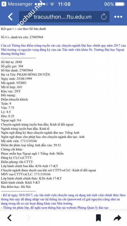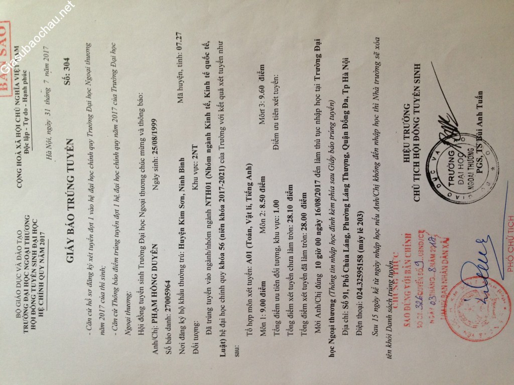 - Năm 2017, mình đã thi đỗ vào trường Đại học Ngoại thương với số điểm đạt được trong kì thi đại học trong các môn cụ thể là: Toán 9; Văn 7,75; Lý 8,5; Hóa 8,5 và Ngoại ngữ 9,6. Tổng điểm trần ba môn khối A1 là 27,1; khối A là 26; khối D là 26,35.