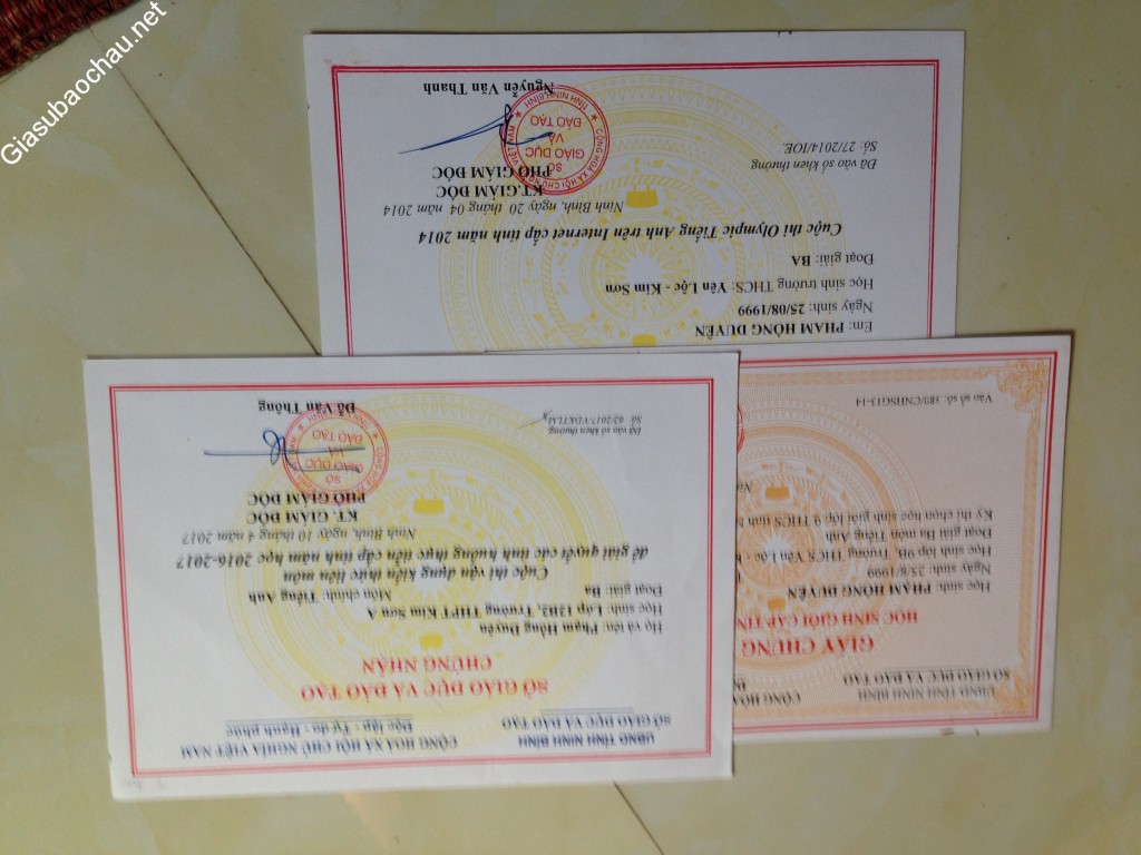 Mình không học cấp 3 tại trường chuyên nào của tỉnh, nhưng bù vào đó là nỗ lực tự học Tiếng Anh song song với quá trình học tập các bộ môn khác trên trường lớp. Và thành quả là giải Ba IOE cấp tỉnh năm lớp 11, lọt Top 40 bạn học sinh trong tỉnh tham gia cuộc thi IOE cấp Quốc gia, giải Khuyến khích cuộc thi Hùng biện tiếng Anh cấp tỉnh, thêm vào đó là các giải thưởng trong các cuộc thi tiếng Anh viết do trường tổ chức hằng năm.