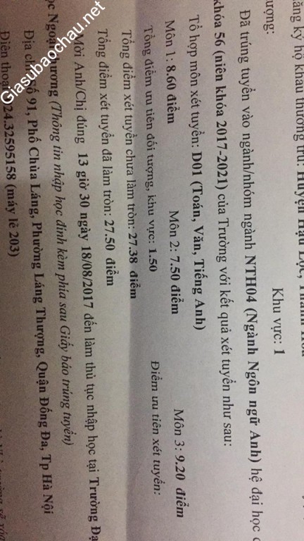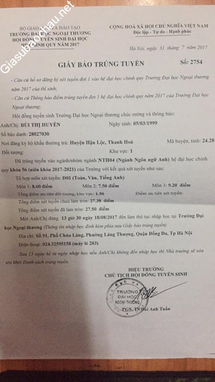 +Trong kì thi THPT QG 2017, em dự thi khối D và đạt tổng điểm 25,3 cả 3 môn. Cụ thể: Toán 8,6 - Văn 7,5 - Tiếng Anh 9,2