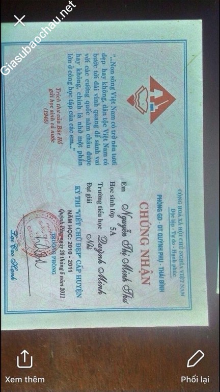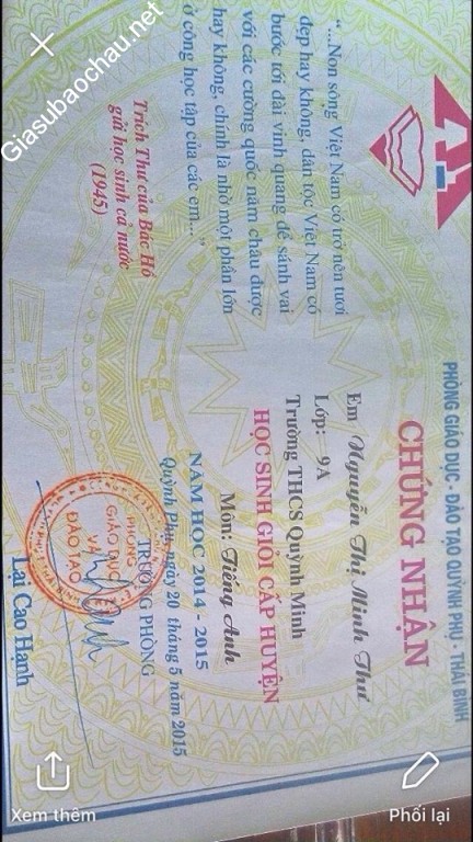 Quý phụ huynh vui lòng xem kỹ thông tin gia sư xem có phù hợp không rồi gọi tới một trong các số: 0966.042.043 (Cô Bảo Châu) - 0966.713.716 (Cô Lệ) của Trung tâm để thông báo việc lựa chọn gia sư này. Trung tâm sẽ gọi điện phỏng vấn gia sư thêm một lần nữa. Nếu gia sư đáp ứng yêu cầu và đồng ý dạy, Trung tâm sẽ gửi số điện thoại của Quý phụ huynh cho gia sư để hai bên trao đổi trực tiếp với nhau.