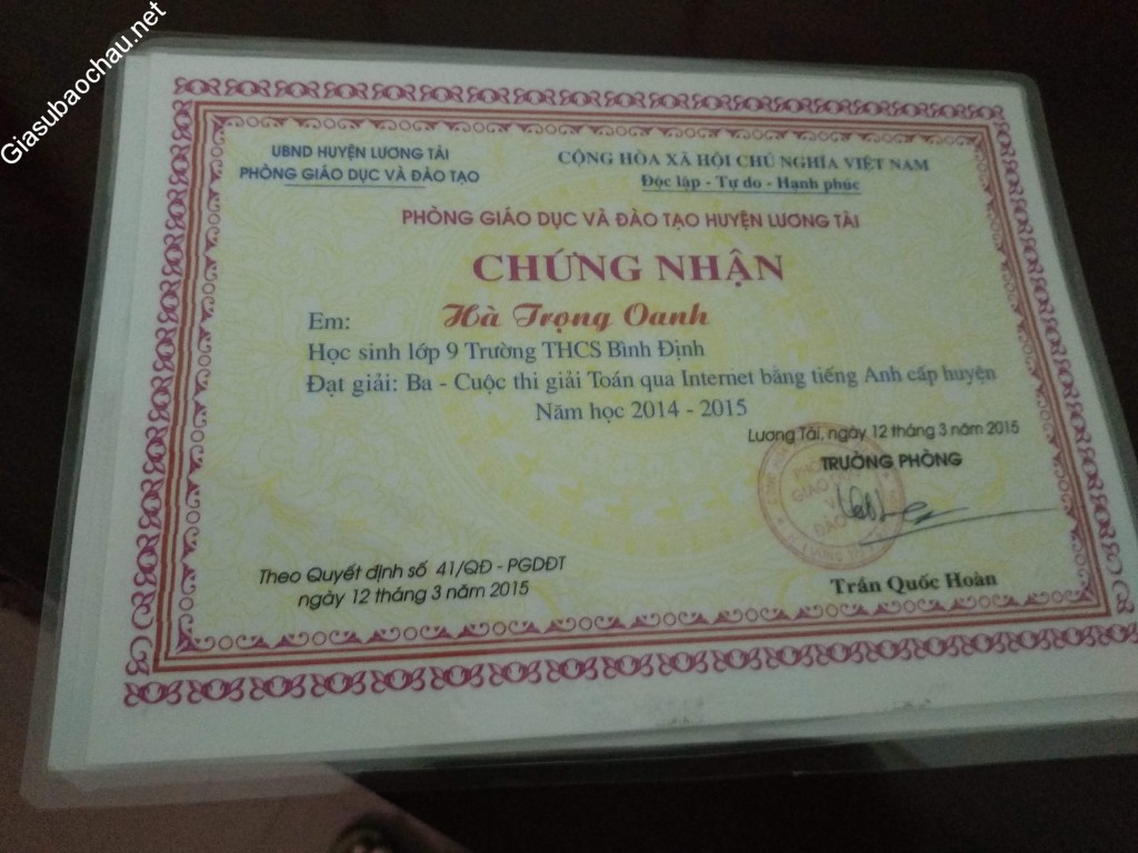 + Cấp 2: lớp 9 đạt giải nhất cuộc thi HSG cấp huyện môn toán, lớp 8 đạt giải ba cuộc thi HSG cấp huyện môn toán, đặc biệt, từ lớp 6 đến lớp 9, năm nào mình cũng đạt giải có số của các kỳ thi qua mạng (IOE, Violympic toán, giải toán bằng tiếng anh qua mạng).