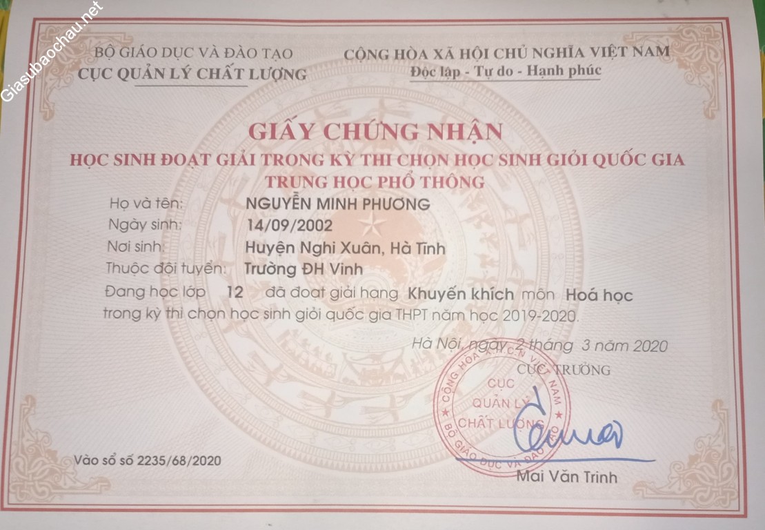 Tôi là Nguyễn Minh Phương, hiện nay đang là sinh viên hệ đào tạo cử nhân chất lượng cao (Lớp tài năng) tại khoa Hóa học - Trường Đại học Sư phạm Hà Nội, diện tuyển thẳng. Tôi đã có bốn năm kinh nghiệm làm gia sư, dạy kèm nhóm lớp. Tôi từng đạt giải Khuyến khích HSG Quốc Gia môn Hóa học. Là thành viên chính thức đội dự tuyển tham dự Kỳ thi chọn HSG Quốc Gia môn Hóa học của trường THPT Chuyên Đại học Vinh - Nghệ An các năm 2019, 2020. Bên cạnh đó, tôi còn nhiều năm là HSG các cấp tỉnh, Thành phố và quận huyện. Không chỉ vậy, tôi là học sinh học lực giỏi 12 năm, với tổng kết trung bình chung của ba năm cấp ba đều trên 9,0 và môn Hóa luôn đạt ngưỡng 9,8; 9,9; 10,0 ở tất cả các học kỳ. Tôi đã tốt nghiệp trường THPT Chuyên Đại học Vinh - Một trong những ngôi trường nổi tiếng với các đề thi thử đại học được săn đón hàng đầu. Tôi tự tin với vốn kiến thức của mình và cách truyền đạt sinh động sẽ hỗ trợ được rất nhiều bạn để chinh phục kỳ thi THPT Quốc Gia, kỳ thi vào lớp 10 THPT Chuyên môn Hóa, kỳ thi HSG các cấp hay chỉ là đạt điểm số cao tại lớp. Chưa hết, về thành tích của các học viên, tôi đã đào tạo được rất nhiều em học sinh đạt giải HSG cấp quận (huyện), tỉnh (thành phố) và tiêu biểu có một số em học sinh đã đậu vào các trường THPT Chuyên nổi tiếng với số điểm môn chuyên (Hóa) đứng top đầu. Hiện nay các lớp tôi đào tạo và luyện thi đều là các em học sinh đến từ các trường chuyên nổi tiếng của Thành phố Hà Nội và Nghệ An (THPT Chuyên Hà Nội Amsterdam, THPT Chuyên Chu Văn An - Hà Nội, THPT Chuyên Đại học Sư phạm Hà Nội, THPT Chuyên KHTN-ĐHQGHN, THPT Chuyên Đại học Vinh - Nghệ An, ...) Rất mong được hỗ trợ các em học sinh trong tương lai!