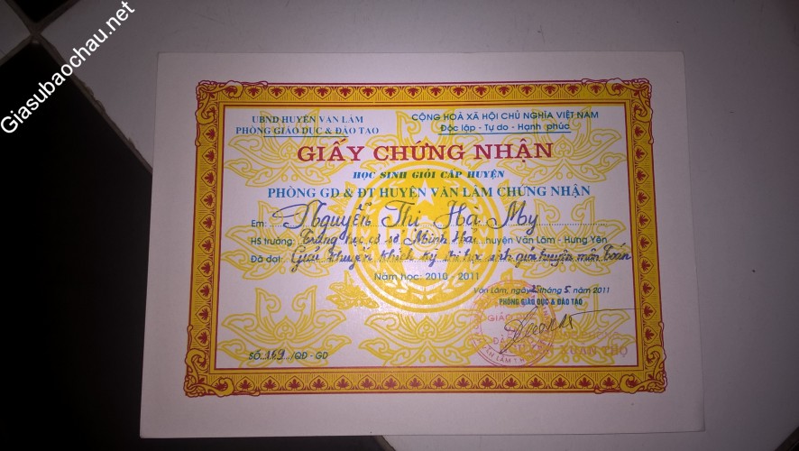 + Đạt danh hiệu HSG huyện môn Toán, môn Hóa năm lớp 9.