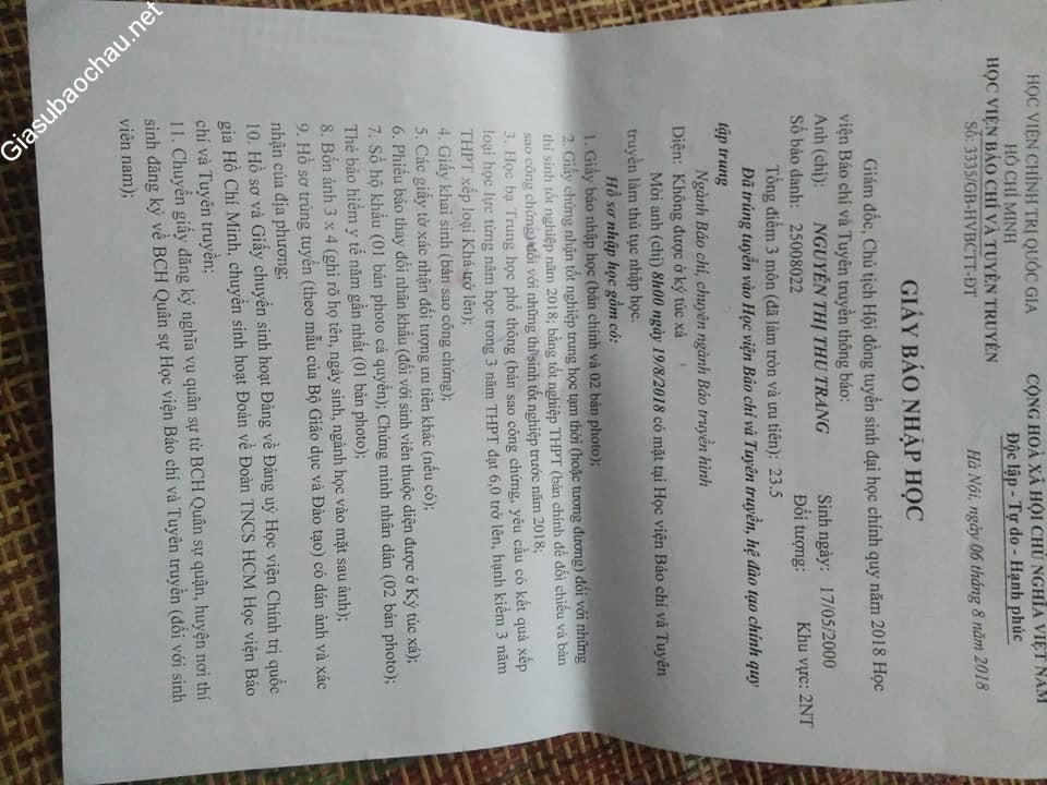 Quý phụ huynh vui lòng xem kỹ thông tin gia sư xem có phù hợp không rồi gọi tới một trong các số: 0966.042.043 (Cô Bảo Châu) - 0966.713.716 (Cô Lệ) của Trung tâm để thông báo việc lựa chọn gia sư này. Trung tâm sẽ gọi điện phỏng vấn gia sư thêm một lần nữa. Nếu gia sư đáp ứng yêu cầu và đồng ý dạy, Trung tâm sẽ gửi số điện thoại của Quý phụ huynh cho gia sư để hai bên trao đổi trực tiếp với nhau.