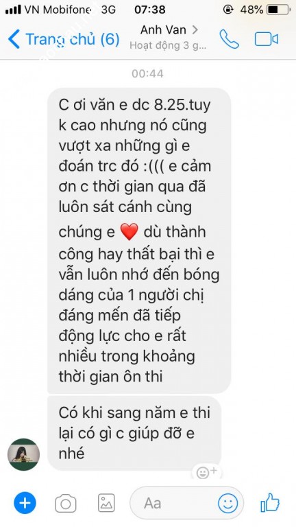 + Tôi đã gia sư cho em Phạm Quỳnh Anh (trường THPT Nguyễn Văn Huyên). Từ một học sinh rất ghét môn văn, không có hứng thú với môn học. Điểm kiểm tra của em chỉ dừng lại ở 5. Bằng những kiến thức đã có cùng tài liệu đã tham khảo tôi đã giúp em đạt 7,6 điểm tổng kết môn văn trong kỳ II năm lớp 12.
