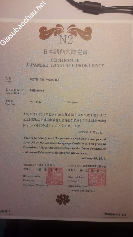 - JLPT N2 (cấp bằng tháng 2/2019)