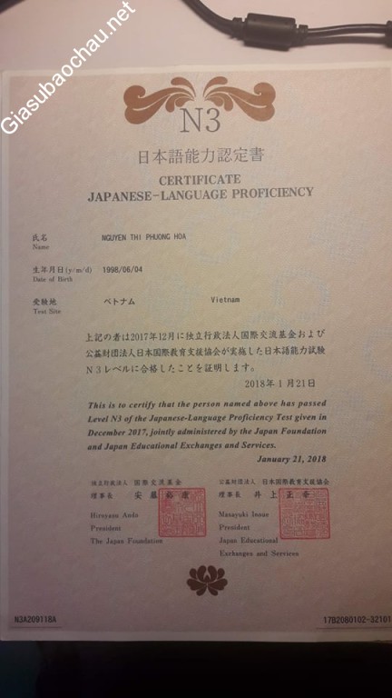 - JLPT N3 (cấp bằng tháng 1/2018)