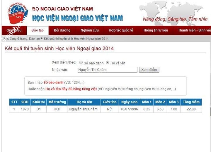 + Học viện Ngoại giao (khối D1) với số điểm 23 : Toán 8,25; Văn 7; Anh 6,5