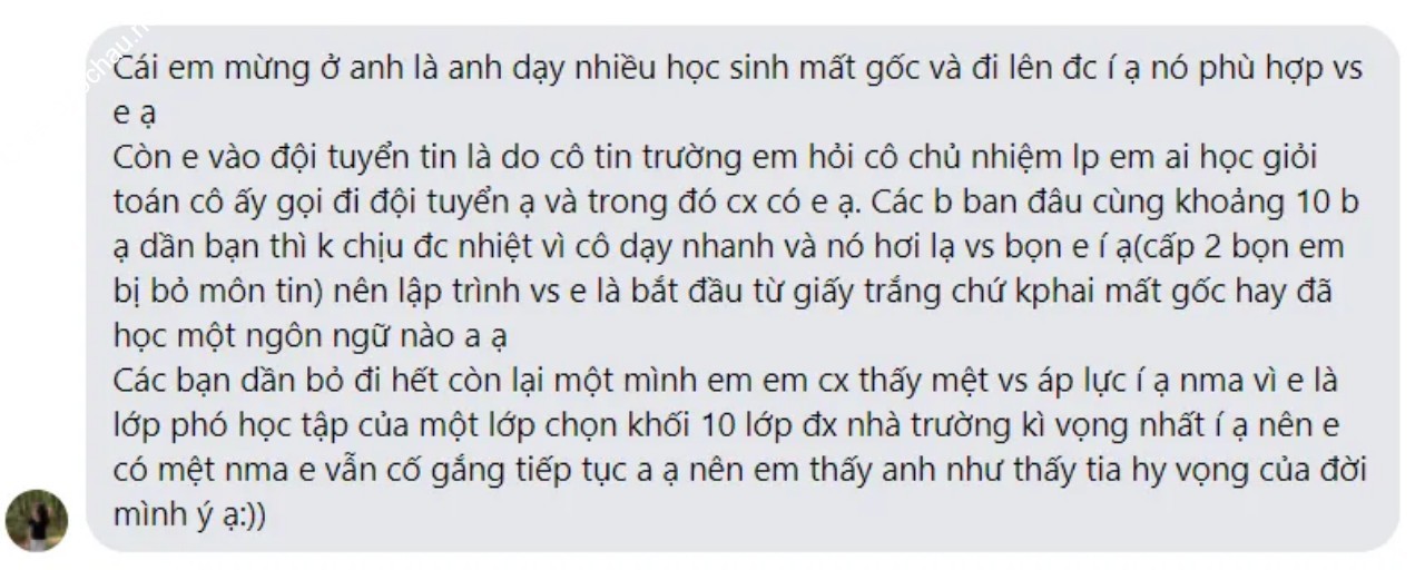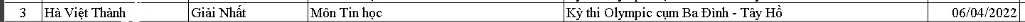 - Theo học khi mất gốc môn Tin ở lớp, sau 4 tháng theo học đạt giải Nhì HSG Tin học cụm Ba Đình - Tây Hồ.