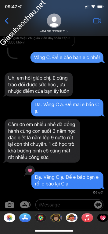 Quý phụ huynh vui lòng xem kỹ thông tin gia sư xem có phù hợp không rồi gọi tới một trong các số: 0966.042.043 (Cô Bảo Châu) - 0966.713.716 (Cô Lệ) của Trung tâm để thông báo việc lựa chọn gia sư này. Trung tâm sẽ gọi điện phỏng vấn gia sư thêm một lần nữa. Nếu gia sư đáp ứng yêu cầu và đồng ý dạy, Trung tâm sẽ gửi số điện thoại của Quý phụ huynh cho gia sư để hai bên trao đổi trực tiếp với nhau.
