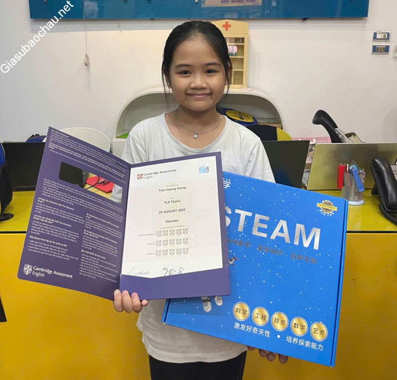 + Trần Hương Giang (lớp 4): Đồng hành 1 năm để thi đạt chứng chỉ Flyers hệ Cambridge (YLE), tương đương với trình độ A2 trong Khung tham chiếu trình độ ngôn ngữ chung châu Âu (CEFR).